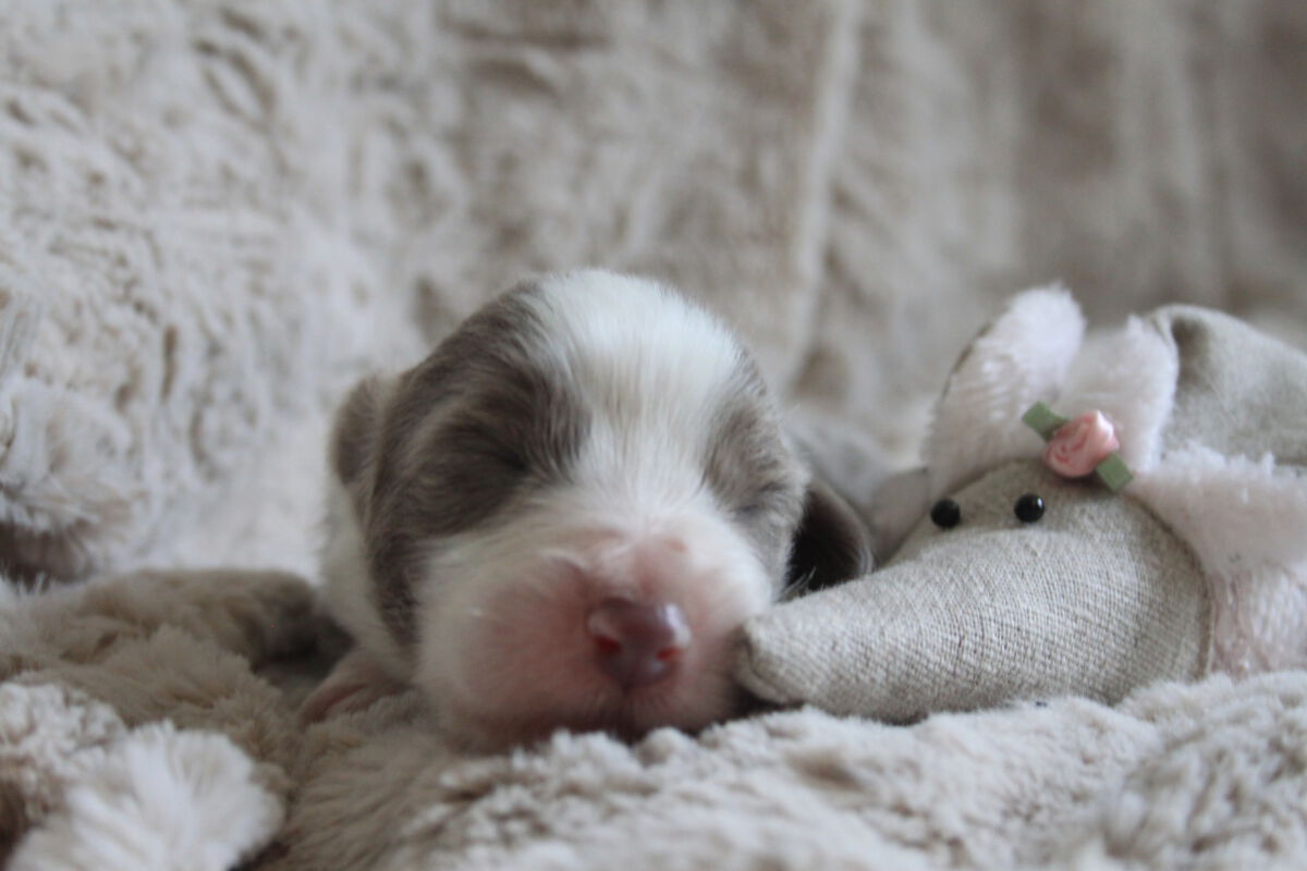Wie immer sind wir völlig erstaunt, wie die Zeit mit Welpen im Haus rast. Nun sind unsere 5 kleinen Mäuse schon eine Woche alt. Sie entwickeln sich ganz prächtig, nehmen ordendlich zu und schlafen sich groß. Aliyah behütet ihre Kinder den ganzen Tag sehr leibevoll und zuverlässig. Sie liebt es bei ihnen zu liegen und sie zu verwöhnen. Viel gibt es in der ersten Woche nicht zur berichten, daher kommen wir gleich zu den Fotos: